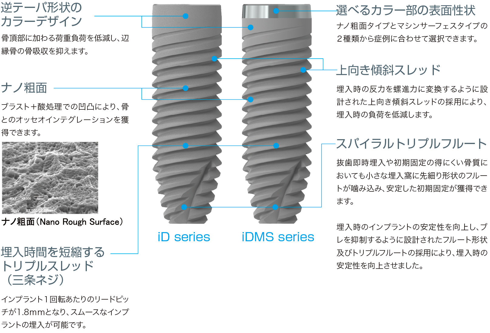 バイオフィックスiDは、幅広い症例に適応する独自のスレッドデザイン「iDスレッド」を採用し、柔らかい骨質や抜歯即時埋入においても、埋入直後から安定した初期固定が得られるよう設計されています。