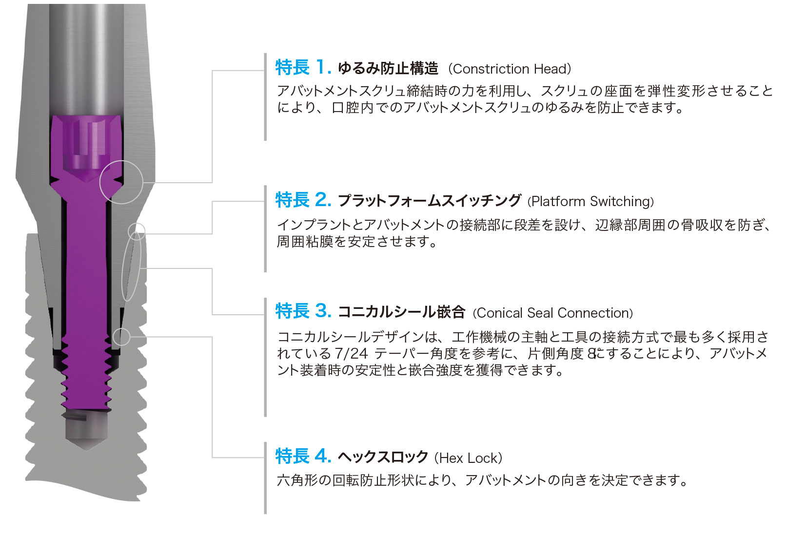 インターナルコニカルコネクションにより、インプラントとアバットメントの固定が得られます。