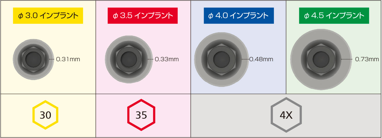 バイオフィックスiD インプラントは、それぞれのサイズに合わせて、3種類のコネクションタイプがあります。